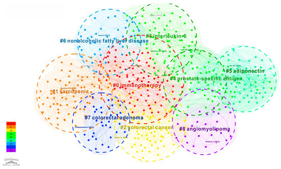 (5) From the cluster knowledge map of research hotspots, the research direction in this field gradually tends from specific cancer symptoms to the impact of patient survival rate and complications after the disease. Researchers pay more attention to the immune system immunity, immune cells interleukin-6 and adiponectin of human body. In addition, the atlas clustering shows that the research focuses of medical researchers in recent years include sarcopenia, colorectal cancer, prostate specific antigen, nonalcoholic fatty liver disease, colorectal adenoma and angiomyolipoma, which are related to cancer and obesity.