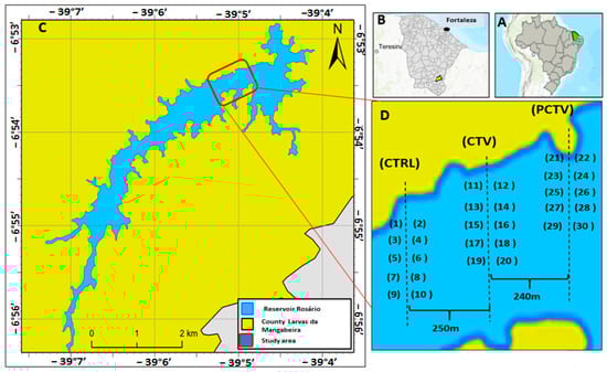 Location of the Rosário reservoir and distribution of collection points, postculture (PCTV), fish farming, culture (CTV) and control (CTRL). (A) Brazil, (B) Ceará (C) reservoir Rosário and (D) study area.