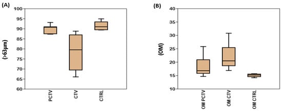 The distribution of the fraction <63 µm, silt/clay, in descending order, corresponded to CTRL, PCTV and CTV. The analysis of variance of the fraction, <63 µm of the PCTV area in relation to CTV and CTRL, resulted in (p < 0.01). However, between CTV and CTRL, there was no statistically significant difference (p > 0.05) (Figure 2A).