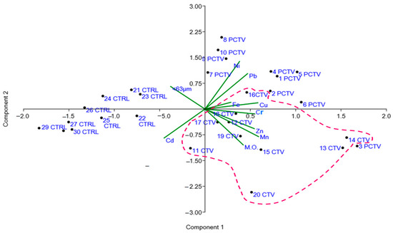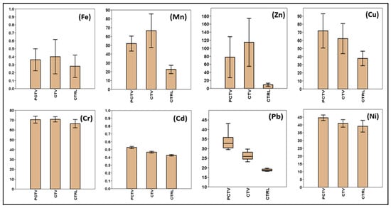 The concentrations of trace metals in the CTV and PCTV areas showed increases in concentrations compared to the CTRL area. In the cultivation area, the highest percentage growths were observed for the metals Zn, Mn, Cu and Pb, and in the postculture area, the highest percentage growth values were for the metals Zn, Fe, Pb and Cu (Table 6).