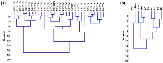 Multivariate analysis of the sediment, comprising Pearson’s correlation (p < 0.05), was used to assess pairs of variables and improve understanding of the relationships between trace metals and the environment. The principal components analysis (PCA) was preceded by the sphericity tests of Bartlett and Kaiser–Meyer–Olkin, the varimax rotation was used to optimize the variance and, finally, the hierarchical cluster analysis (HCA) was performed using the Ward method to verify similarity across the Euclidean distance.