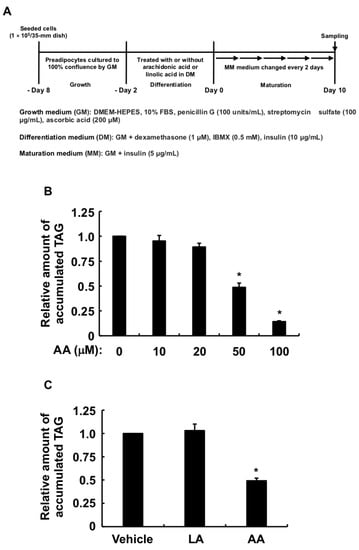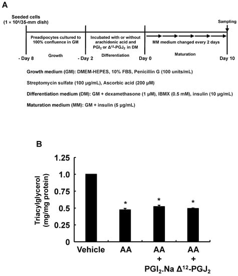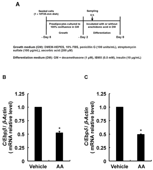 - Khan, F.; Syeda, P.K.; Nartey, M.N.; Rahman, M.S.; Islam, M.S.; Nishimura, K.; Jisaka, M.; Shono, F.; Yokota, K. Pretreatment of cultured preadipocytes with arachidonic acid during the differentiation phase without a cAMP-elevating agent enhances fat storage after the maturation phase. Prostaglandins Other Lipid Mediat. 2016, 123, 16–27. [Google Scholar] [CrossRef]