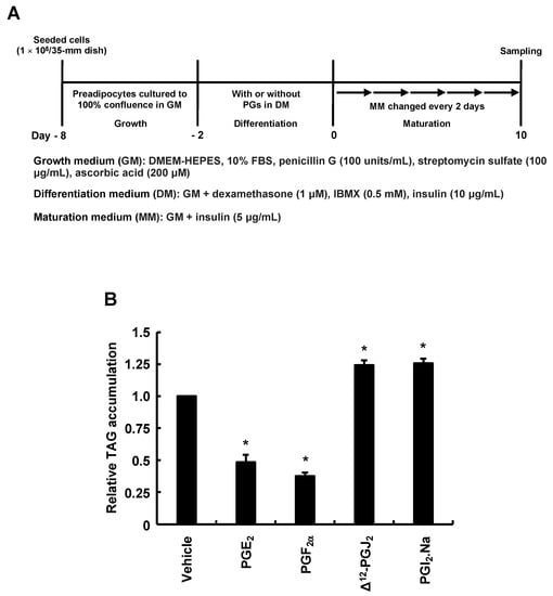 3.2. Types of PGs Biosynthesized by Adding AA during Only the Differentiation Phase of 3T3-L1 Cells and Effects of PGs Added during Only the Differentiation Phase on MDI-Induced Adipogenesis