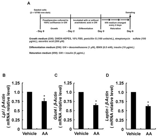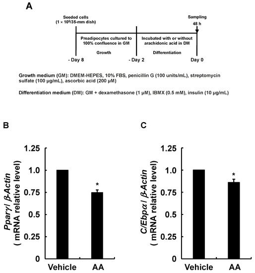3.3. Adipogenesis-Related Gene Expression in Response to AA during the Differentiation Phase
