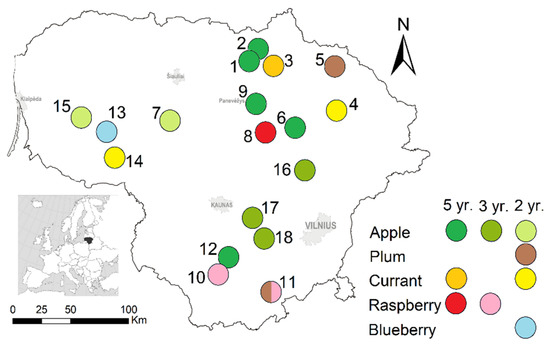 Eighteen areas with fruit and berry farms (63.7 ha on average) in Lithuania were surveyed between 2018 and 2022 (Figure 1). A few sites were only surveyed in 2018–2019 and were subsequently abandoned for logistical reasons (sites in the west of the country) or poor results, such as a blueberry plantation or young apple orchards, where small mammals were absent due to very intensive agricultural practices. In each area, crops were combined with control habitats, either hay meadows/non-hay meadows or forests. Additional details about the study sites are presented in [27].