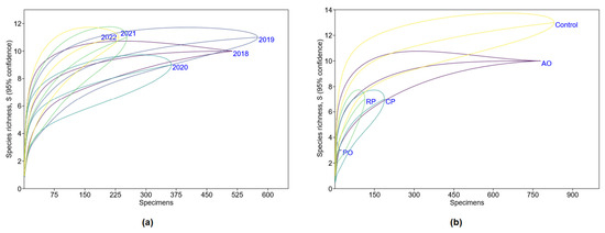 We also tested whether the non-equal trapping efforts in between years and habitats affected the results. A positive correlation between the number of trap days and the number of trapped individuals and the number of registered species was found. To eliminate the influence of the unequal trapping effort, we constructed species accumulation curves using individual-based rarefaction and assessed the existence of a sample size threshold, i.e., a minimum number of individuals trapped [38,39,40]. The analysis was performed with the PAST software.