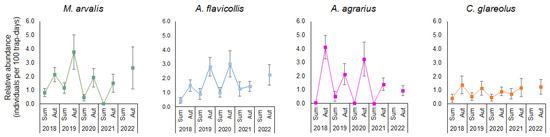 The average relative abundance of all four species was significantly higher in autumn than in summer. The relative abundance of M. arvalis increased from 0.67 to 2.44 (post hoc, p < 0.001), of A. flavicollis from 0.86 to 2.18 (p < 0.001), and of C. glareolus from 0.54 to 1.19 individuals per 100 trap days (p < 0.05). The same significant differences persisted from year to year (Figure 3).