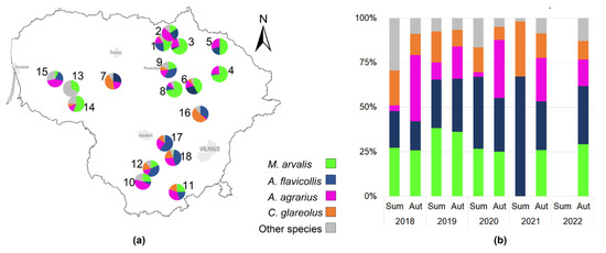 Seasonally, the proportions of C. glareolus and A. flavicollis decreased in autumn, the proportions of M. arvalis remained stable, and the proportions of A. agrarius increased (Figure 4b).