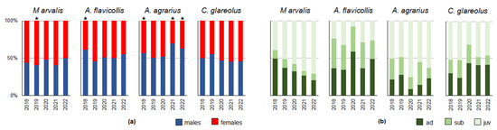 By year, females prevailed in M. arvalis between 2018 and 2021 (Figure 5a), with the highest proportion in 2021 (p < 0.10) and 2019 (59.5%, CI = 52.6–66.2%; G = 14.6, p < 0.001). A. flavicollis was significantly male-dominated in 2018; A. agrarius was significantly male-dominated in 2018, 2021 (69.4%, CI = 55.5-81.0%; G = 13.5, p < 0.001), and 2022; and C. glareolus had a sex ratio of 1:1 in all years.