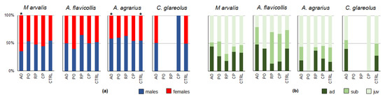 Changes in small rodent population structure by habitat: (a)—male-to-female ratio (asterisks denote significant differences based on the G-test results); (b)—proportions of age groups; AO—apple orchard; PO—plum orchard; CP—currant plantation; RP—raspberry plantation; CTRL—control habitats).