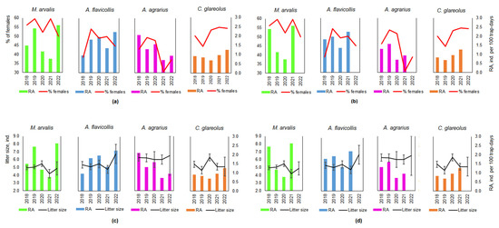 Relation of the proportion of females in the population and the average litter size to the relative abundance (RA) in the same year (a,c), and in the following year (b,d).