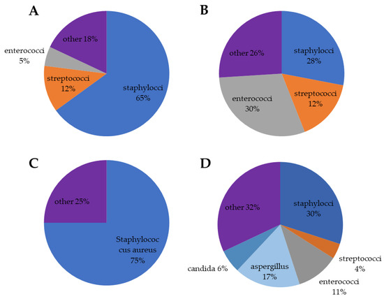 Distribution of pathogens in different clinical settings. (A) cardiac device related-infective endocarditis; the other group includes Candida spp., other fungi, Gram-negative bacilli and polymicrobial. (B) transcatheter aortic valve implantation (TAVI); the other group includes Gram-negative bacille, Moraxella, candida albicans, Histoplasma and corynebacterium. (C) right-sided infective endocarditis; the other group includes streptococci, coagulase-negative staphylococcal, pseudomonas aeruginosa and fungi. (D) immunosuppressive therapy in solid organ transplantation; the other group includes Gram-negative bacilli, Corynebacteria, Clostridium ramosum, Pseudallescheria boydii, Nocardia asteroids and Polymicrobial.