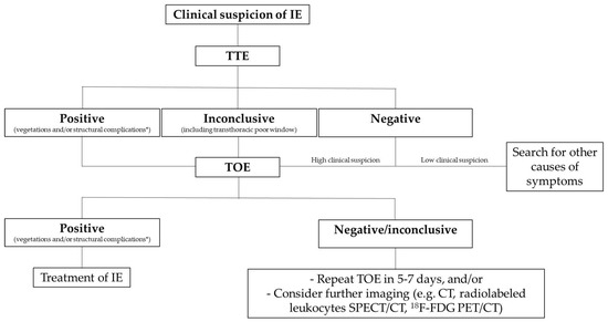 Echocardiography, either TTE or TOE, is the mainstay of cardiac imaging for IE diagnosis, and it must be performed as soon as IE is suspected [60]. It is considered positive for IE in the presence of vegetations and/or structural complications, including abscesses, leaflet perforation, aortic pseudoaneurysm and intracardiac fistula. Echocardiography is also useful to evaluate any associated mitral or aortic valve dysfunction and the underlying left ventricular function. Generally, TTE is the first diagnostic tool in patients with suspected IE, with a high specificity (close to 100%) and modest sensitivity (about 75%) [60]. In particular, false-negatives may be found if vegetations are small or have embolized. Therefore, the absence of vegetations on TTE does not exclude IE diagnosis, although the finding of a valve with normal morphology and function greatly reduces its probability [61]. TOE sensitivity is higher than TTE in detecting both vegetations and cardiac complications; thus, in most cases, TOE follows TTE in the diagnostic workup of IE [62,63]. TOE becomes necessary when TTE is negative (or the transthoracic window is poor) but the clinical suspicion of IE is high, a valve vegetation is found with concern of intracardiac complications (e.g., new conduction delay due to paravalvular abscess), and vegetation is associated with significant valvular regurgitation to be quantified before surgery. Conventional TOE may be completed by 3D analysis, which provides a more precise estimate of the vegetation’s size with a better prediction of the embolic risk [64]. If initial TOE is negative but the clinical suspicion of IE remains high, TTE and/or TOE should be repeated in 7 days, or even earlier in the case of Staphylococcus aureus infection [65,66]. False-positive findings may occur when performing TOE in the presence of cardiac tumors (e.g., valve fibroelastomas), mural thrombi or fibrous valvular strands (including Lambl’s excrescences) [67].