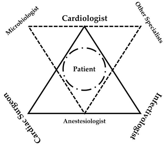 Schematic view of Endocarditis Team. The continuous line indicates the main specialists involved in the decision-making process where the patient is in the center. Discontinuous line indicates the other medical specialists that might be involved according to the single case.