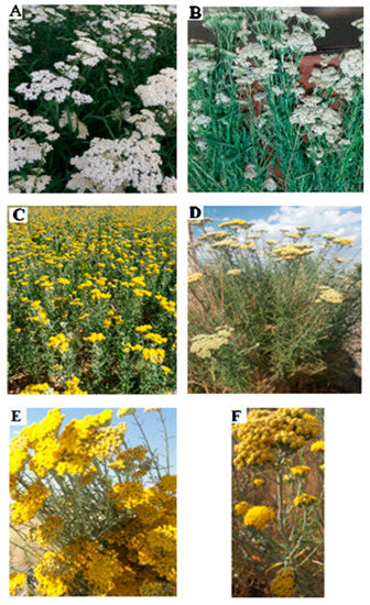The genus Achillea has a long history of use in traditional medicine as an anti-inflammatory, diaphoretic, anti-spasmodic, tonic, diuretic, and emmenagogic agent [3], and it has been used as a natural remedy (in Iranian traditional medicine) for the treatment of bleeding, headaches, respiratory infections, inflammation, spasmodic diseases, flatulence, dyspepsia [4,5], pneumonia, hemorrhaging, rheumatic pain, and wounds, and it is useful for liver disease and acts as a mild sedative [6]. Currently, the different medicinal functions of yarrow, such as its use as a spasmolytic, a choleretic, a wound-healing treatment, and an anti-inflammatory treatment, as well as its antifungal activities, have made it an important medicinal plant [3,7,8,9,10,11].