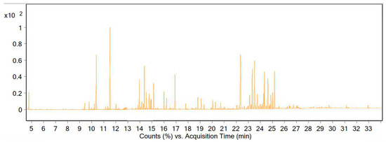 According to the GC-MS data, the essential oil of this plant contained 88 compounds. The essential oil of A. tenuifolia Lam was orange-yellow in color, with a yield of 0.82% (% v/w). The main chemical composition of the desert yarrow essential oil is presented in Table 3 and Figure 4. We identified 21 compounds that constituted 73.48% of the essential oil.