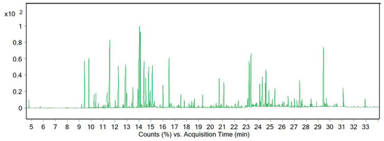 The essential oil of A. wilhelmsii C. Koch was yellow in color, with a yield of 0.89% (% v/w). The GC-MS results revealed that the essential oil of this plant in the target area comprised 106 substances, of which 21 compounds represented 66.93% of the total essential oil (Table 2 and Figure 3).