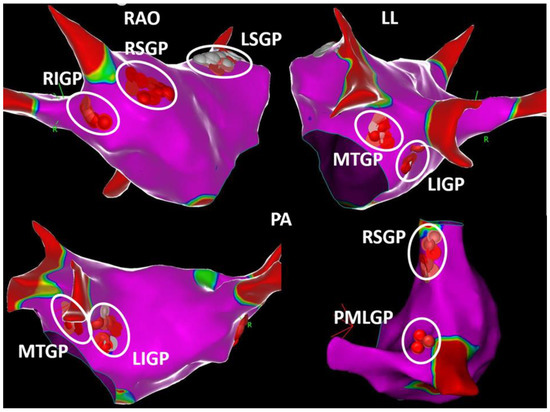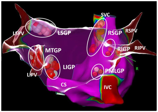 Anatomic GP modification may be performed using the technique initially described by Katritsis [52] and later modified by Pokushalov [47,55]. With or without merging cCT, presumed GP clusters can be ablated 1–2 cm outside the PV–LA junction at the following sites by using irrigated-type catheters: LSGP, LIGP, RSGP, and RIGP. The ablation procedure endpoints were the elimination of local electrical activity (peak-to-peak bipolar EGM < 0.1 mV) and the abolishment of any thermal-induced vagal effects with RF applications.