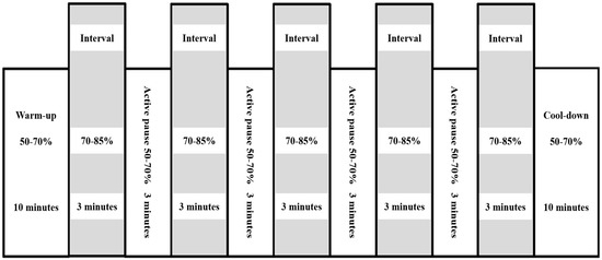 The aerobic exercise program was conducted through interval training: a 10-min warm-up at 50–70% of the heart rate reserve (HRR), followed by five 3-min intervals of walking on a treadmill at 70–85% of the HRR, four 3-min walks at 50–70% of the HRR, and a 10-min cool down at 50–70% of the HRR. HRR is the difference between the resting heart rate (HR) and maximum HR and was calculated using the results of each subject’s first cardiopulmonary exercise test (CPET) data. A schematic illustration of interval training is provided in Figure 1. Adjustments were made so that all patients maintained the target HR at equivalent HRR percentages. Metabolic equivalents were calculated from the speed and slope of the treadmill, which were adjusted continuously to ensure that every training session was performed at the assigned HR. All training sessions were monitored by medical staff through electrocardiography, oxygen saturation and HR measurements, and measurement of the subjective rated perceived exertion (RPE) and modified Medical Research Council score to reduce the risk of possible complications during exercise. To verify the safety of PR, a record of any adverse events, including major cardiovascular or other musculoskeletal complications, was noted by the medical staff whenever the aerobic exercise program was performed.