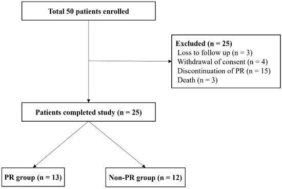Originally, 50 patients who met the criteria were enrolled in this study, but 25 patients met the exclusion criteria or were lost to follow-up. Therefore, 25 patients completed the study, 13 patients in the PR group and 12 patients in the non-PR group (Figure 2).