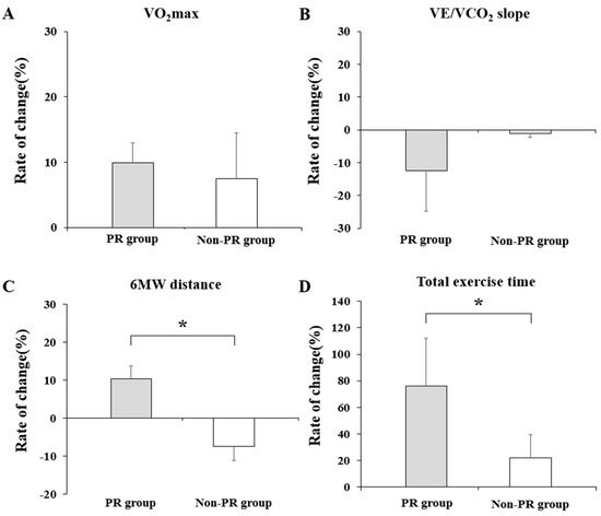 In the PR group, the VO2max and VE/VCO2 slopes showed a significant improvement after eight weeks (p = 0.006 and p = 0.02, respectively), but the difference in the rate of change from that in the non-PR group was not statistically significant (p = 0.115 and p = 0.088, respectively) (Table 2).