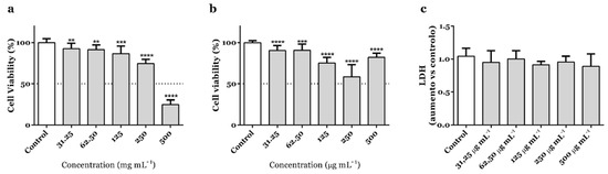 The impact on the mitochondrial performance of adenocarcinoma AGS cells was now reinvestigated within a range of concentrations (31.25–500 µg mL−1) using an extract obtained from samples of A. africanus stem bark collected in a different location in Guinea-Bissau. Compared with untreated control cells, the extract significantly decreased the cell viability of AGS cells at the full range of concentrations, being worthwhile to note the reduction down to 24.9 and 74.5%, being recorded at 500 and 250 µg mL−1 (p < 0.0001), respectively (Figure 1a). The selectivity upon AGS cancer cells [22] is further suggested by the effects in human fetal lung fibroblast MRC-5 cells (Figure 1b). At 500 µg mL−1, A. africanus stem bark extract caused a reduction on the cell viability that was 3.3-fold-weaker (Figure 1b) than the one recorded in AGS cells at the same concentration (Figure 1a). However, while it was possible to observe that all concentrations caused a statistically significant change on the viability of MRC-5 cells, the effect was not concentration-dependent, differing from the effects upon AGS cells. Lactate dehydrogenase (LDH) release assay was used to elucidate if permeabilization of the plasma membrane occurred, i.e., potentially indicating necrotic cell death, but no significant effects have been recorded up to concentrations as high as 500 µg mL−1 (Figure 1c).