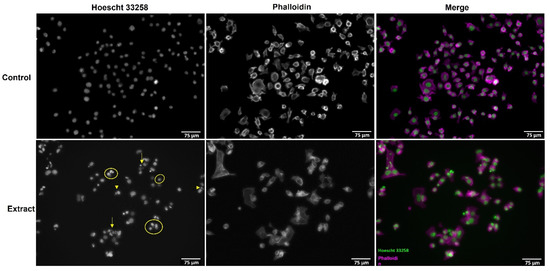 Morphological evaluation of the effect of the hydroethanolic extract from A. africanus stem bark on the AGS cell line after 24 h of incubation. The extract was tested at 500 µg mL−1. Overall cell morphology was assessed using phalloidin (cytoplasmic characteristics) and chromatin status (Hoechst 33258). Arrows—apoptotic bodies; circles—chromatin condensation.