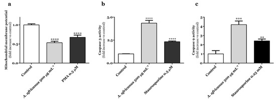 As shown in Figure 3b,c, the activities of caspases-3 and -9 in gastric adenocarcinoma AGS cells were greatly enhanced upon 24 h-treatment with the hydroethanol extract obtained from the stem bark of A. africanus (500 µg mL−1). It is worth noting that the recorded effects demonstrate a higher caspase activity than it was observed upon exposure to staurosporine (Figure 3b,c).