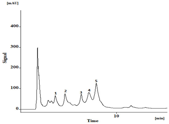 HPLC-DAD profile (340 nm) of the hydroethanolic extract from A. africanus stem bark. Compounds: (1) vicenin-2; (2 and 3) vicenin-2 derivatives; (4) 2″-O-rhamnosyl vitexin; and (5) 2″-O-rhamnosyl vitexin derivative.