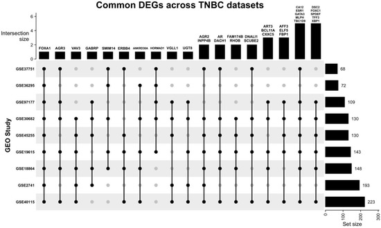 In order to identify consistently differentially expressed genes specific to TNBC compared to other types of breast cancer, we explored the publicly available transcriptomics data repository of the National Center for Biotechnology Information (NCBI), the Gene Expression Omnibus (GEO) (https://www.ncbi.nlm.nih.gov/geo/, accessed on 2 January 2023)—a genomic data repository—for datasets of patients with breast cancer. For consistency, we selected publicly available datasets which can be analyzed using GEO2R, a built-in platform within NCBI GEO, to carry out differential gene expression analysis on microarray data. This platform utilizes the computer language R and the limma statistical package to carry out various statistical calculations, such as the empirical Bayes statistics, to identify genes that are differentially expressed between different patient groups.