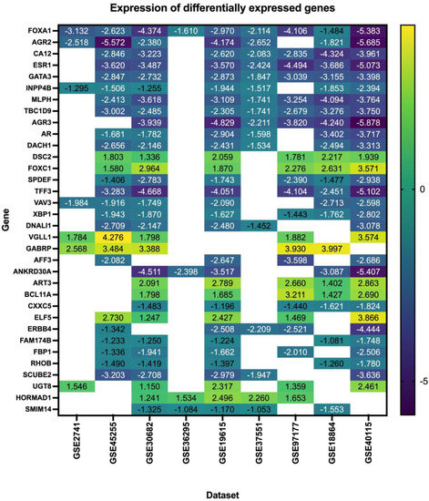 Our search yielded nine datasets that met our criteria, with a total of 1350 patient samples across the nine datasets. The re-analysis of these datasets revealed a total of 1217 DEGs in all datasets (Supplementary Files S1–S9), 34 of which are consistent across five of the nine datasets (50%) (Figure 2, Table 2, Supplementary File S10), with these genes being either up- or down-regulated. Of the significant and common 34 genes, 26.4% of the genes (n = 9) were up-regulated, and the remaining 73.5% (n = 25) were down-regulated. FOXA1 was the only consistently down-regulated gene across all nine datasets. The log fold change of the 34 DEGs is represented in Figure 3.