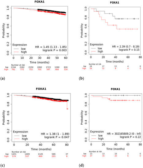 However, these in silico studies need in vitro validation to confirm any final conclusions. Furthermore, in silico data can result in contradicting results due to the varying patient types and accompanying clinical information in each dataset. This has been observed in some of our data, as cBioPortal has only one TNBC patient with a FOXA1 mutation, compared to Breast Cancer Gene-Expression Miner v4.7, which has several TNBC patients with high or low expression. Therefore, the use of one database is not enough and several tools need to be used, as we have in our re-analysis.