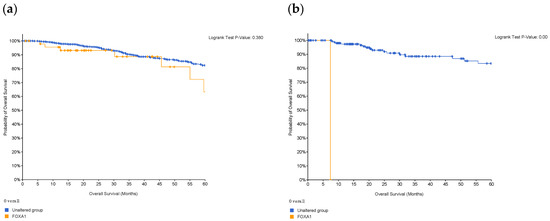 A Kaplan–Meier plot was used to test the FOXA1 regulation effect on the survival rate of all breast cancer patients (n = 2976). Patients with high and low FOXA1 expression were compared at a follow-up threshold of five years. Figure 4a reveals that high expression of FOXA1 is associated with a worse prognosis. This low prognosis was consistent when each subtype of breast cancer—TNBC (n = 126), ER/PR–positive (n = 2005), and HER2-positive (n = 30)—was analyzed individually, as shown in Figure 4b–d. Furthermore, another analysis of the TCGA breast cancer dataset from cBioPortal showed that patients with a mutated FOXA1 had a lower survival rate than those without a FOXA1 mutation (Figure 5). However, it is of importance that only one TNBC patient had a mutated FOXA1 in this dataset.