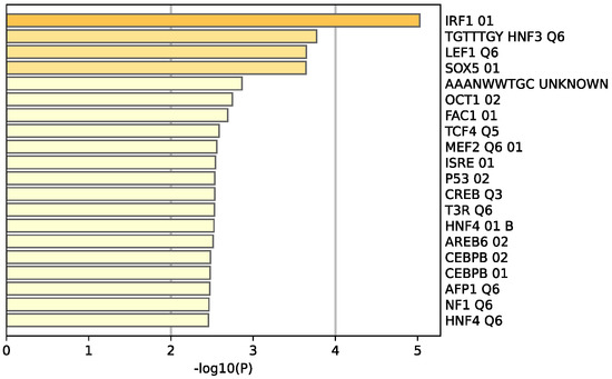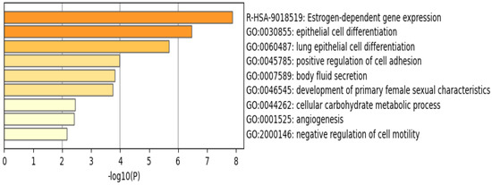 The functional pathway analysis of the 34 common DEGs performed via Metascape provided the pathways these genes were associated with (Figure 6). The most enriched pathway is that of estrogen-dependent gene expression followed by epithelial cell differentiation. Furthermore, the majority of these genes appear to be regulated by the transcription factor interferon regulatory factor 1 (IRF-1), as illustrated in Figure 7.