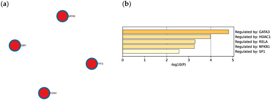 The Molecular Complex Detection (MCODE) algorithm was utilized to identify densely connected network components. Four genes (GATA3, FOXA1, TFF3, and ESR1) were found to be involved in protein–protein interactions (Figure 8a). Extended enrichment analysis showed that most of the genes were regulated primarily by GATA3, as shown in Figure 8b.