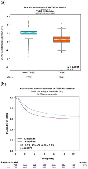 - Byrne, D.J.; Deb, S.; Takano, E.A.; Fox, S.B. GATA3 expression in triple-negative breast cancers. Histopathology 2017, 71, 63–71. [Google Scholar] [CrossRef]