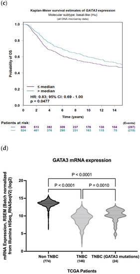 Furthermore, mRNA expression of TCGA patients reveals that non-TNBC patients had higher GATA3 expression compared to TNBC patients (Figure 9d). In TNBC patients, those with mutations in their GATA3 had a significantly higher expression (p = 0.001) than those without any mutation in their GATA3. These TNBC patients with the GATA3 mutation—all of which are amplification—had a higher survival rate than those without the mutation, which supports the idea that increased GATA3 expression increases survival.