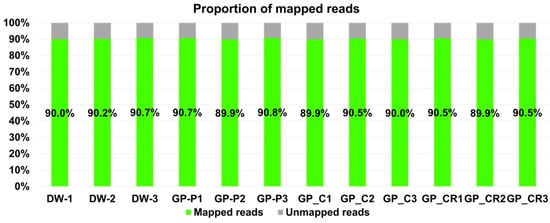 Raw data were mapped onto the human reference genome (GRCh38) using the BBMap program with default parameters. The proportion of mapped reads in each library ranged from 90.7% to 89.9% (Figure 2). Approximately 10% of the sequenced reads in each library were not associated with human transcripts.