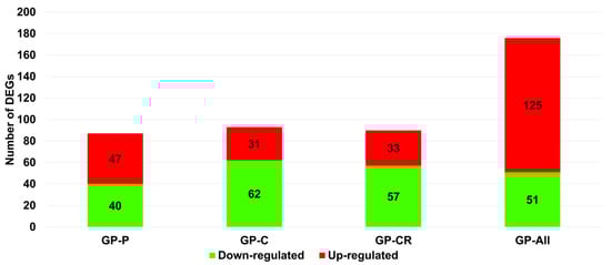 We identified DEGs by comparing the GP extract-treated and control samples. The numbers of DEGs identified under treatments with the three extracts were very similar (Figure 3). Among the extracts, GP-C (93 DEGs) showed the highest number of DEGs, followed by GP-CR (90 DEGs) and GP-P (87 DEGs). In addition, we combined all GP extract-treated samples, referred to as GP-all, and compared them to the control conditions, resulting in the identification of 176 DEGs. In both GP-P and GP-all conditions, the number of upregulated genes was higher than that of downregulated genes. The number of upregulated genes (125 genes) was almost three times that of the downregulated (51 genes) in GP-all. In contrast, the number of downregulated genes was much higher than that of the upregulated genes in the GP-C and GP-CR conditions.