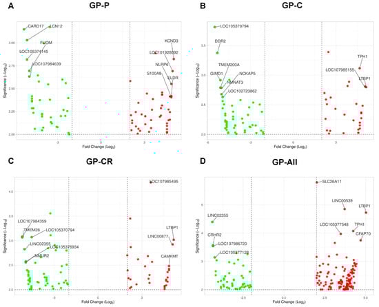 Volcano plot displaying the top ten differentially-expressed genes in each condition. Differentially-expressed genes were identified in four different groups such as GP-P (A), GP-C (B), GP-CR (C), and GP-All (D) as compared to the control group. Green and red colors indicate down- and upregulated genes, respectively. The top ten ranking genes are indicated by respective gene names based on the Manhattan distance using the VolcaNoseR program.