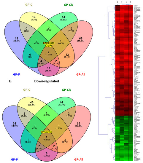 We compared the number of DEGs identified under the four conditions. In total, 168 DEGs were highly upregulated (Figure 5A), while 174 were highly downregulated (Figure 5B). Of the 168 upregulated genes, LTBP1 and LINC00539 were commonly identified under all four conditions (Figure 5A). The expression of LINC02355 was highly downregulated under all four conditions (Figure 4B). Many DEGs were condition-specific. For example, 69 upregulated and 32 downregulated genes were identified only under the GP-all condition. We examined the expression of the 176 DEGs identified from the GP-all condition in the other three conditions using a heatmap (Figure 5C). The heatmap showed that the expression of most DEGs identified in the GP-all condition was quite similar to that in the other three conditions.