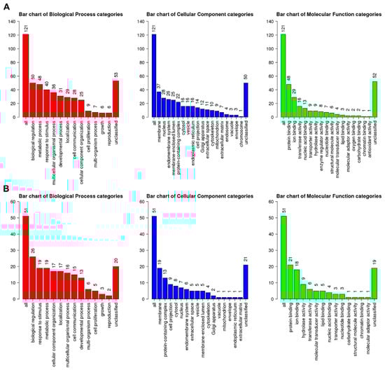 Summary of assigned gene ontology (GO) slim for 176 DEGs. The number of assigned (A) upregulated genes and (B) downregulated genes according to three categories for GO ontology, namely biological process, cellular component, and molecular function.