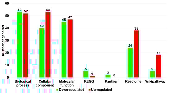 Enriched gene set for 176 DEGs based on several functional databases. To identify enriched gene sets, enrichment analyses were conducted based on gene ontology (biological process, cellular component, and molecular function), KEGG, Panther, Reactome, and Wikipathway using the WebGestalt program. Green and red colored bars indicate down- and upregulated genes, respectively. p < 0.05 was used as a cutoff.