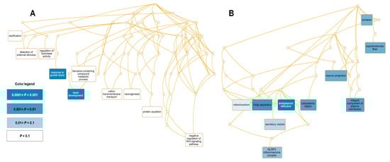 Significantly enriched GO terms for 125 upregulated genes. Directed acyclic graphs (DAGs) display the most significant GO terms for upregulated genes according to (A) biological process and (B) cellular component. The DAG displays the hierarchical relationship of identified GO terms. The blue colored boxes indicate the most significant GO terms. The significance is indicated by the color intensity.