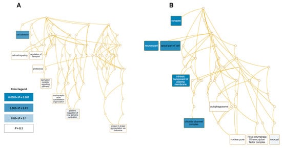 Significantly enriched GO terms for 51 downregulated genes. DAGs display the most significant GO terms for upregulated genes according to (A) biological process and (B) cellular component. The DAG displays the hierarchical relationship of identified GO terms. The blue colored box indicates the most significant GO terms. The significance is indicated by the color intensity.