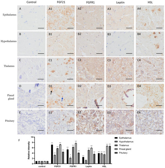 Distribution of FGF21, FGFR1, leptin, and hormone-sensitive lipase (HSL) in camel central nervous system (CNS) tissues. (A–E) In control group, primary antibodies were replaced by nonspecific IgG in an immunohistochemistry (IHC) assay; only the nuclei were stained blue with hematoxylin dye in camel epithalamus, hypothalamus, thalamus, pineal gland, and pituitary, respectively. (A1–E1) IHC staining of FGF21 in camel epithalamus, hypothalamus, thalamus, pineal gland, and pituitary, respectively. (A2–E2) IHC staining of FGFR1 in camel epithalamus, hypothalamus, thalamus, pineal gland, and pituitary, respectively. (A3–E3) IHC staining of leptin in camel epithalamus, hypothalamus, thalamus, pineal gland, and pituitary, respectively. (A4–E4) IHC staining of HSL in camel epithalamus, hypothalamus, thalamus, pineal gland, and pituitary, respectively. (F) The optical density (OD) of IHC stain was evaluated using Image-Pro Plus 6.0. Data are presented as mean ± SD of triplicate experiments. * p < 0.05, ** p < 0.01 (Student’s t-test). Scale bars: 50 μm.
