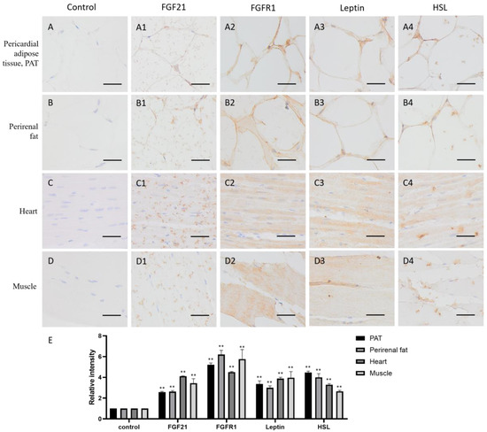 Distribution of FGF21, FGFR1, leptin, and hormone-sensitive lipase (HSL) in camel adipose and muscle tissues. (A–D) In control group, primary antibodies were replaced by nonspecific IgG in an immunohistochemistry (IHC) assay; only the nuclei were stained blue with hematoxylin dye in camel pericardial adipose tissue (PAT), perirenal fat, heart, and muscle, respectively. (A1–D1) IHC staining of FGF21 in camel PAT, perirenal fat, heart, and muscle, respectively. (A2–D2) IHC staining of FGFR1 in camel PAT, perirenal fat, heart, and muscle, respectively. (A3–D3) IHC staining of leptin in camel PAT, perirenal fat, heart, and muscle, respectively. (A4–D4) IHC staining of HSL in camel PAT, perirenal fat, heart, and muscle, respectively. (E) The OD of IHC stain was evaluated using Image-Pro Plus 6.0. Data are presented as mean ± SD of triplicates. ** p < 0.01 (Student’s t-test). Scale bars: 50 μm.