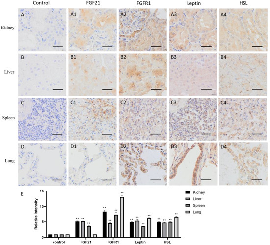 Distribution of FGF21, FGFR1, leptin, and hormone-sensitive lipase (HSL) in camel visceral organs. (A–D) In control group, primary antibodies were replaced by nonspecific IgG in an immunohistochemistry (IHC) assay; only the nuclei were stained blue with hematoxylin dye in camel kidney, liver, spleen, and lung, respectively. (A1–D1) IHC staining of FGF21 in camel kidney, liver, spleen, and lung, respectively. (A2–D2) IHC staining of FGFR1 in camel kidney, liver, spleen, and lung, respectively. (A3–D3) IHC staining of leptin in camel kidney, liver, spleen, and lung, respectively. (A4–D4) IHC staining of HSL in camel kidney, liver, spleen, and lung, respectively. (E) The OD of IHC stain was evaluated using Image-Pro Plus 6.0. Data are presented as mean ± SD of triplicates. ** p < 0.01 (Student’s t-test). Scale bars: 50 μm.