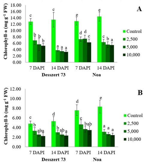Since the relative chlorophyll content is an index, the amounts of photosynthetic pigments (chlorophyll-a, chlorophyll-b, and carotenoids) were also measured. The increased spore concentration (2500, 5000, and 10,000 sporidia/mL) had significant effects on chlorophyll-a in both hybrids at both sampling times. Chlorophyll-a content of Desszert 73 and Noa significantly decreased (p < 0.05) when infected by the three corn smut concentrations (87%, 127%, and 146% in Desszert 73, and 79%, 75%, and 106% in Noa) at 7 DAPI compared to the control plants. At the second sampling time (14 DAPI), the reductions were 254%, 286%, and 316% for Desszert 73 and 127%, 160%, and 167% for Noa, respectively. Noa had the most significant reduction when the highest sporidium treatment was applied (means for at 7 and 14 DAPI at 10,000 sporidia/mL followed by different letters) (Figure 3A).