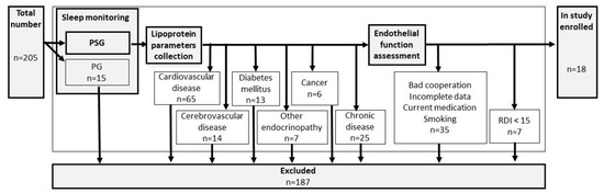 Inclusion criteria were set up as follows: suspicion of OSA, sleep monitoring by polysomnography, and aged over 18. A detailed search for premorbid diseases was performed and exclusion criteria included: cardiovascular disease, cerebrovascular disease, diabetes mellitus, other endocrinopathies, cancer, or any other chronic diseases. Sleep monitoring by limited polygraphy (PG), bad cooperation, incomplete data, use of any current medication, or smoking belonged to the additional exclusion criteria. For details, see flowchart Figure 1.